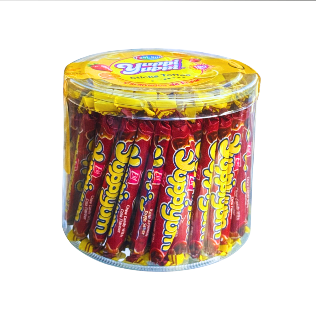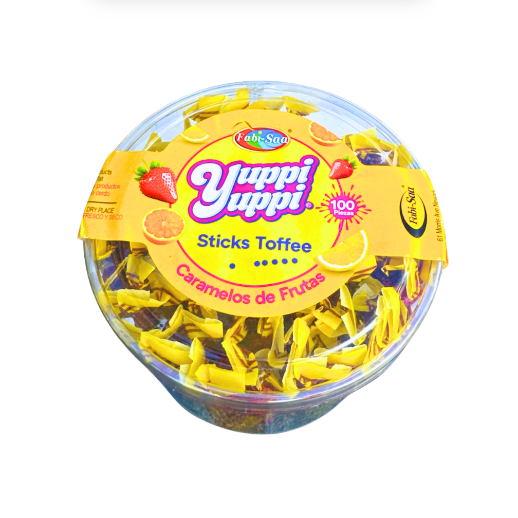 Disfruta de la frescura y el sabor frutal en cada bocado con los Yuppi Yuppi Sticks Toffee de FABI-SAA . Un clásico que combina suavidad y dulzura en caramelos de frutas irresistibles, perfectos para compartir en familia, regalar o tener siempre a la mano.