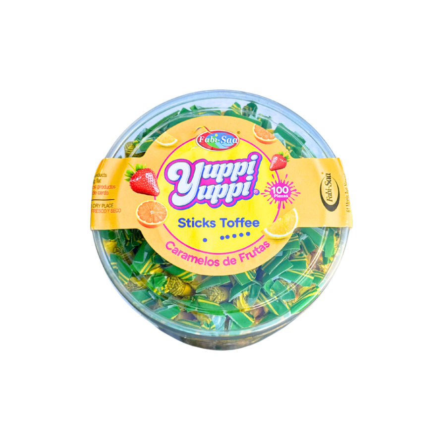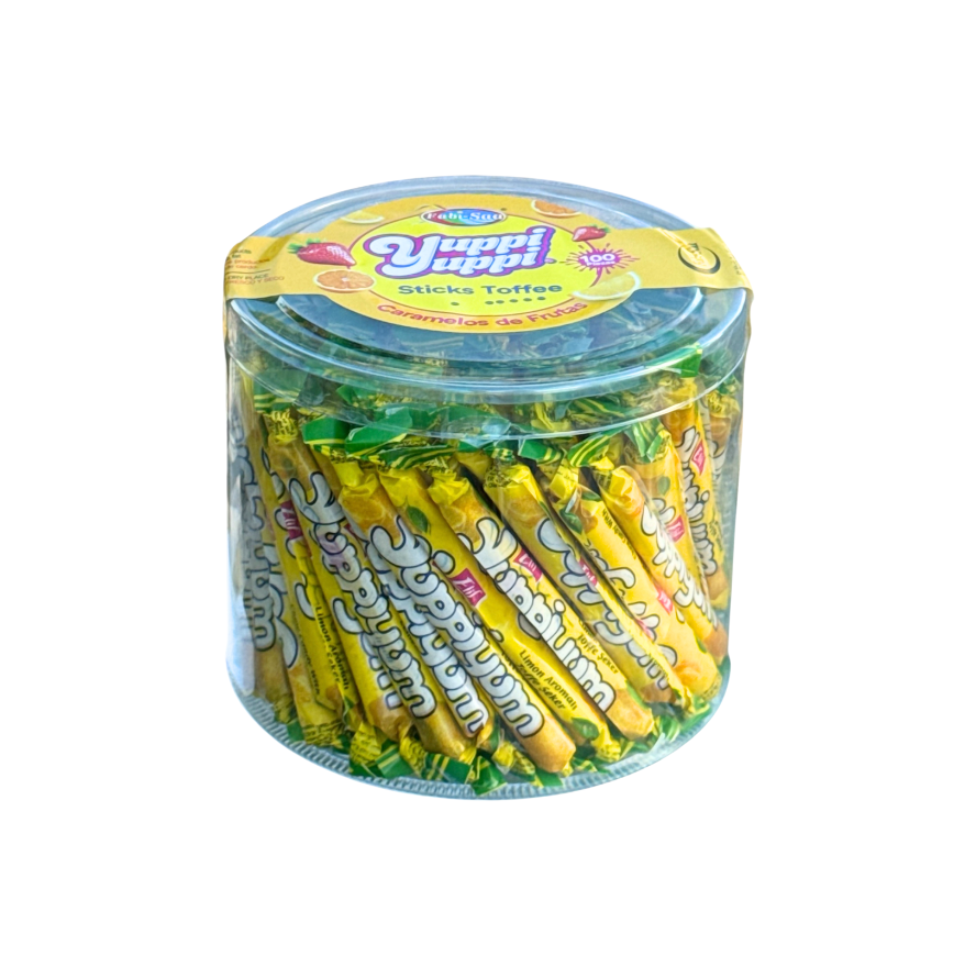 Disfruta de la frescura y el sabor frutal en cada bocado con los Yuppi Yuppi Sticks Toffee de FABI-SAA . Un clásico que combina suavidad y dulzura en caramelos de frutas irresistibles, perfectos para compartir en familia, regalar o tener siempre a la mano.