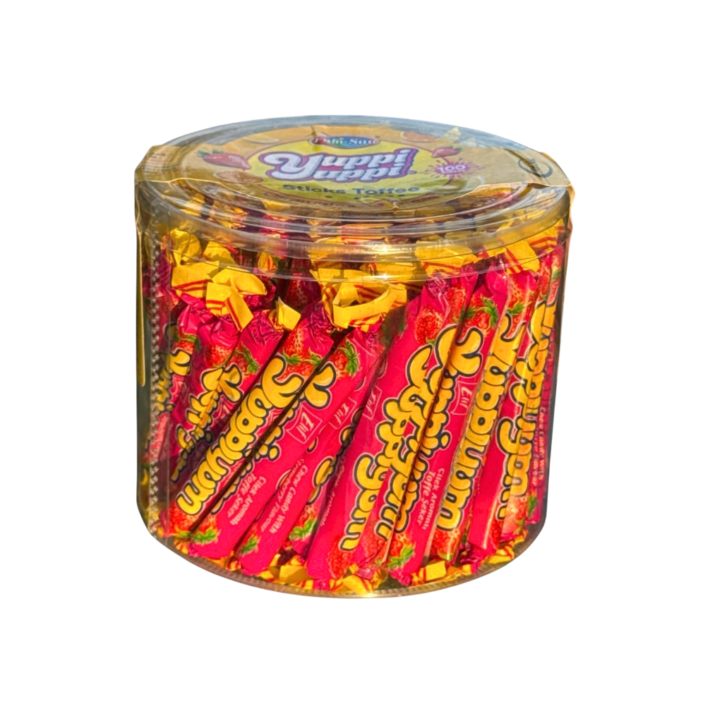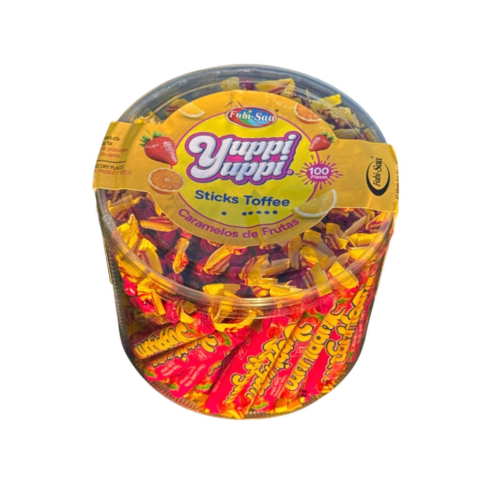 Disfruta de la frescura y el sabor frutal en cada bocado con los Yuppi Yuppi Sticks Toffee de FABI-SAA . Un clásico que combina suavidad y dulzura en caramelos de frutas irresistibles, perfectos para compartir en familia, regalar o tener siempre a la mano.